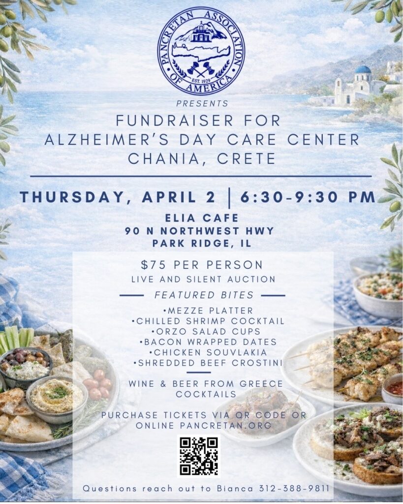 April 2, 2026 [6:30-9:30 PM] – Fundraiser for Alzheimers Day Care Center (Chania, Crete) Hosted at Elia Cafe in Park Ridge